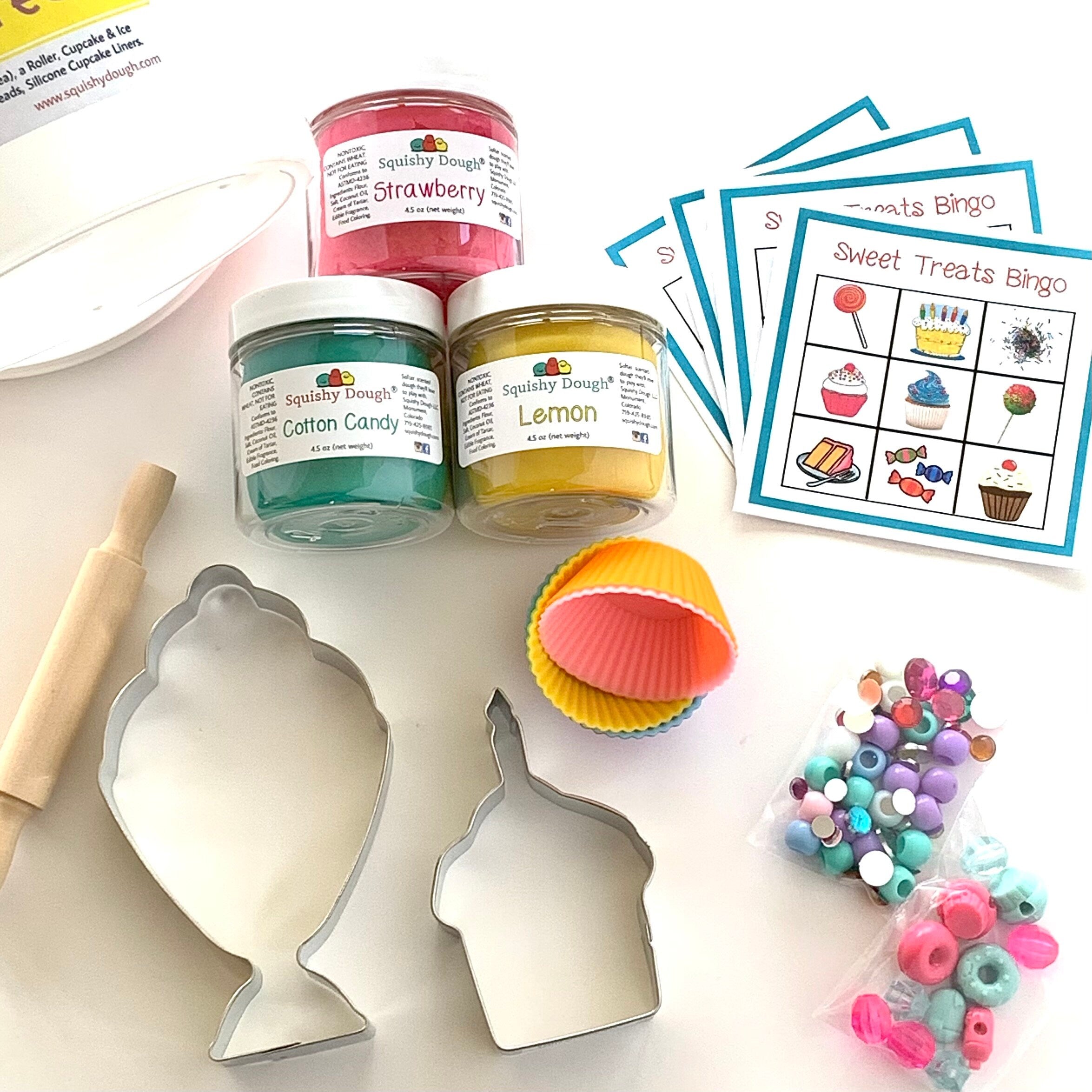 Create your own sweets shop with sundaes and cupcakes out of soft, scented homemade Squishy Dough. This set is perfect for warm summer days and sunshine! It includes 3 scented dougSquishy Doughs, Sundae and Cupcake shapes, silicone cupcake molds, adorable decorating beads, and a small wooden rolling pin. It's dough much fun!